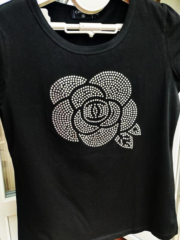 Футболка черного цвета с аппликацией из страз. Цвет черный-яркий, ткань приятная. ПОГ-46см, длина 58см.