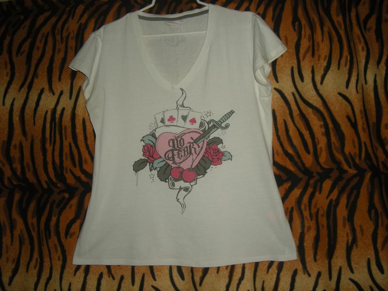 Шикарная фирменная,натуральная футболка белого цвета с аппликацией впереди и маленькой аппликацией сзади,объем груди-102см.,длина-66см.