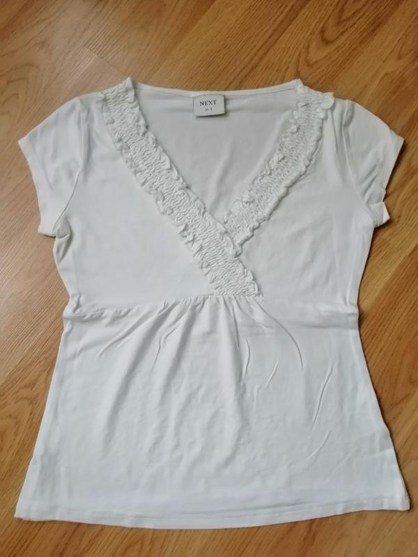 Белоснежная, нарядная, мягкая футболочка. Длина по средине спинки 50 см, впереди длина от конца рюша 26 см, ширина рюша 5 см, плечи 43 см, подмышки 39 см, низ 43 см, рукавчик от плеча 9 см, от подмышки 2 см, ширина 13 см.