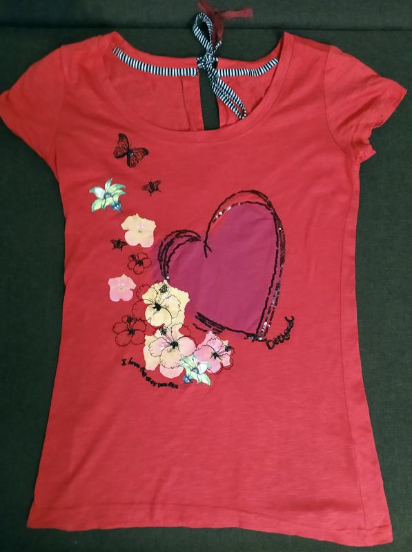 Бесплатная доставка в почтоматы Новой почты 24-26 августа! Футболка от известного бренда Desigual, славящегося своими неординарными вещами. Сзади на завязках. Хлопок, тянется. Состояние новой вещи, бирки срезаны. Дефектов нет. Длина 63 см, ПОГ 40 см, ПОТ 37 см.