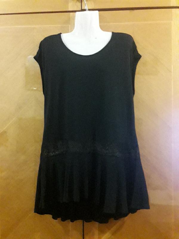 На бирке размер 16. Спереди короче. Замеры делали внутри. Полуобхват груди 52 см ( тянется до 66 см) , по талии 50 см , по низу 82 см. Ширина между плечами 56 см. Высота по спине от плеча у горловины 80 см , от подмышек 48 см , по переду по середине 56 см. Основная ткань 100% вискоза, кружево 100% полиэстер. ❗Отправим после полной оплаты на карточку Приватбанка. ❗Доставка Новой или Укр почтой за счет покупателя. *05211*