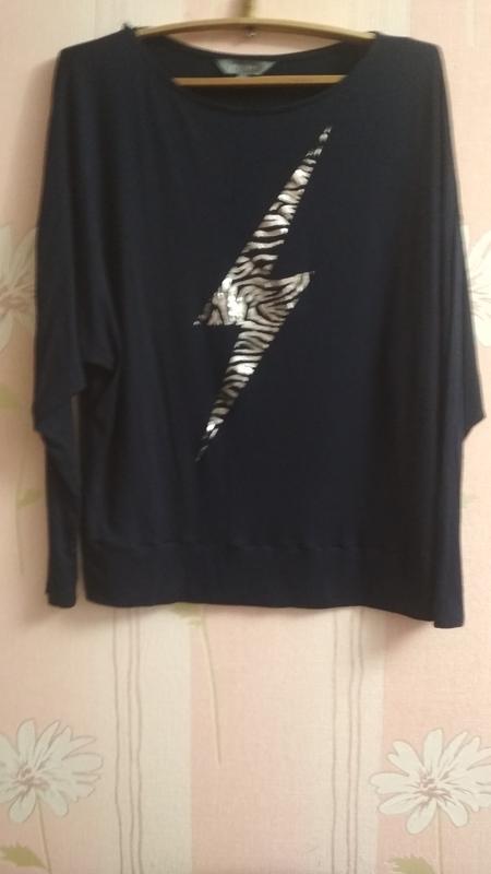 лёгкая кофточка- футболка темно- синего цвета, с длинным рукавом, рукав летучая мышь. спереди серебристая аппликация.