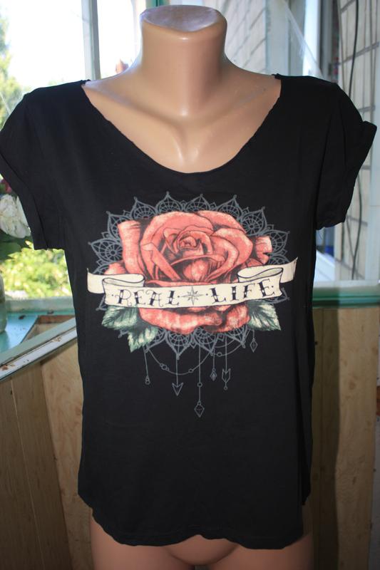 Хлопковая чёрная футболка с принтом "Роза" Состояние отличное! Размер примерно М Замеры: длина 56, грудь 48, бёдра 48. Ткань потянется. В наличии большой выбор серёжек-кисточек, стильной бижутерии, недорогой интересной одежды и очков! Заходите в гости)