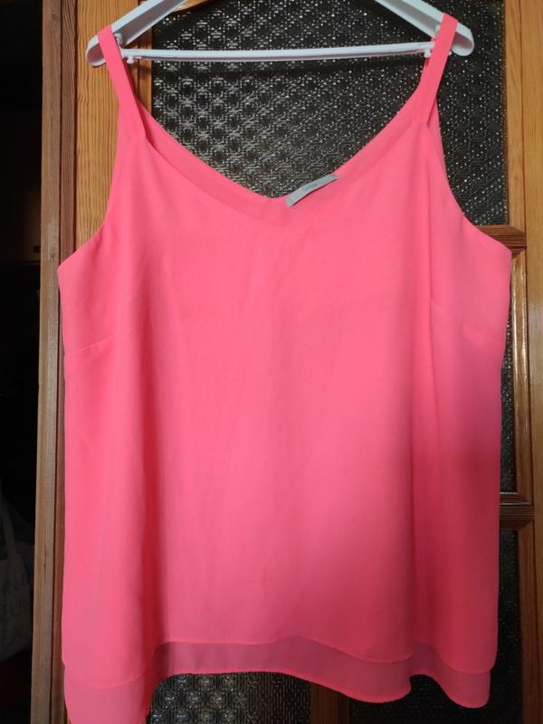 Шифонова майка, блуза неонового рожевого кольору, спереду подвійна тканина. Розмір 18, наш 54-56, довжина 70, ПОГ 58-61, низ 69. Стан ідеальний!