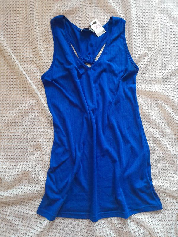 Легка подовжена майка для відпочинку Primark Нова, з етикеткою. Сток, може мати запах обробки , піде після прання. Легкий трикотаж в рубчик, поліестер з віскозою. Ідеальна річ для відпчинку, на морі, можна вдома. Цікава спинка. Ефектний яскравий колір кобальт Розмір XS, крой вільний Довжина 72см, під руками 46см, ПОТ 43см, ПОБ 50см, по низу 56см