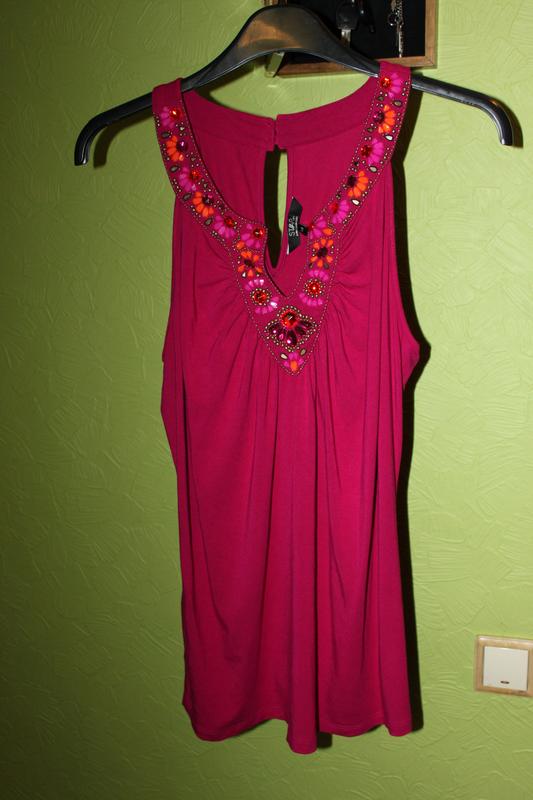 Нарядная трикотажная женская майка, туника, указан eur разм. 18 и подойдет на наш 54 размер Фирма Star, Англия. Цвет малиновый, украшена камнями. Состояние идеальное, без дефектов. Очень красивая и хорошее качество. Хорошо тянется и ложится по фигуре, не скатывается, не теряет форму и цвет после стирки. Состав: 95% вискоза, 5% эластан. Замеры: длина 71 см, ПОГ 55см, низ 56см.