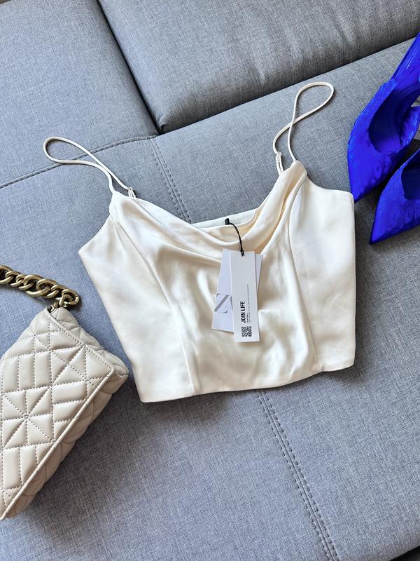 УКОРОЧЕННЫЙ ТОП ИЗ САТИНА Zara Новый с бирками Топ с драпированным вырезом, тонкими регулируемыми бретелями и потайной застежкой-молнией сбоку. Топ держит форму так как есть пластиковые вставки внутри Размер М Care for fiber: не менее 50% переработанного полиэстера. 100 % полиэстер Обмена , торга , возврата нет