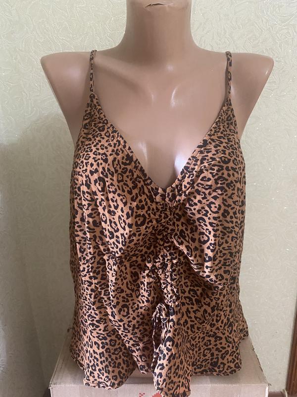 Вискозная маечка в модный тигровый принт на тонких брителях. Брытельки регулируются( что очень удобно). По низу мае маечки пришита баска (7 см), с переда по центу регулируется стяжками. Замеры: пог 50, длина 55 (регулируется длиной брителя)