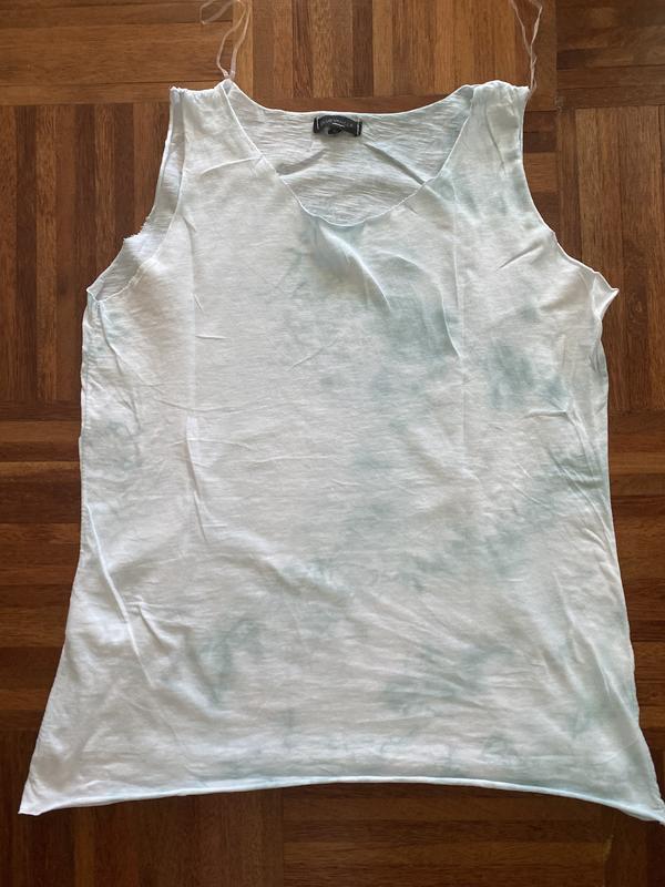 Майка итальянского производства с необработанными краями, состояние новой, цвет бело бирюзовый.