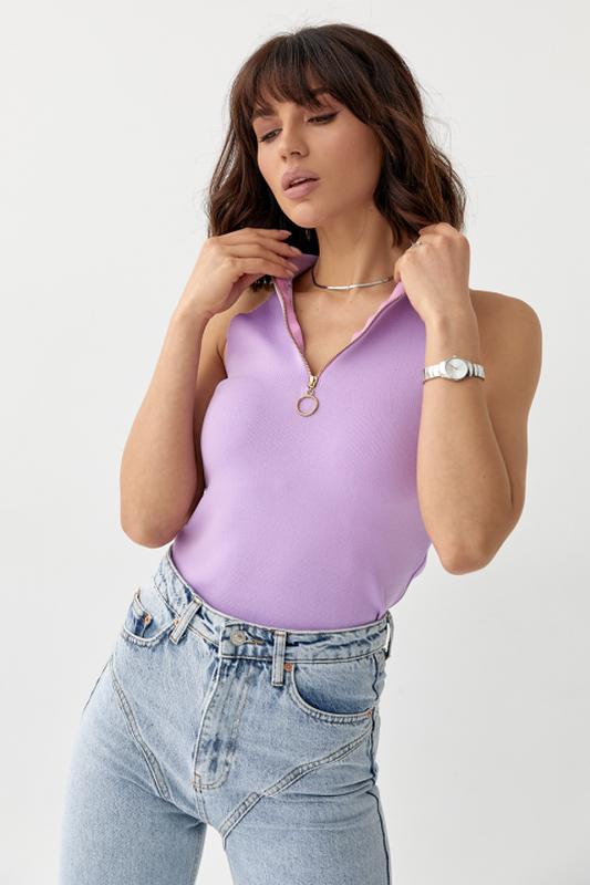 Выбираете удачную пару для приталенной юбки, стильных джинсовых шортиков или укороченных брюк? Приобретите соблазнительный и дерзкий топ под горло на молнии без рукавов. Высокая горловина в стиле резинка отлично удерживают топ и делают ключицу довольно изящной. Золотистая молния длиной 18 сантиметров, отлично выделяется и является своеобразным акцентом.