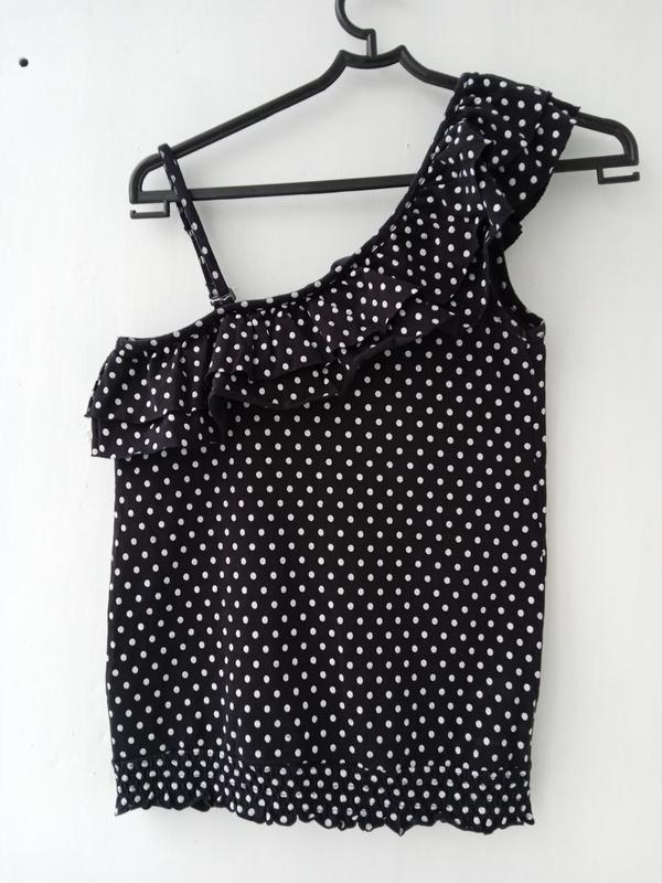 Майка в горошек с воланом через плечо. Бретель регулируется. Низ прошит резинкой. Хлопок. Состояние хорошее.