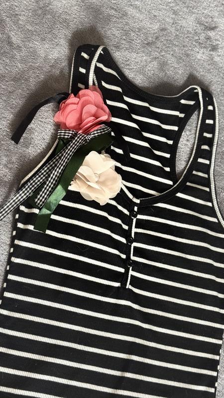 Стильна майка в лапшичку.. Красиво поєднання кольору.. З красивими декоративними квіточками,стрічками... Приємна до тіла..відмінної якості.. Йде на розмір xs-s Відмінно сидить на фігурі. Виглядає дуже стильно,яскраво...і ефектно.. Гарно під джинси,брюки,спідничку..шортики..