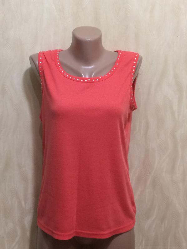 Майка трикотажная с декором по горловине, новая (без этикетки). Ткань состав 65% коттон, 35% полиэстер. Красивый кораловый цвет. Размер написан L, идет на 48-50 смотрите замеры ПОГ 48-51см ПОТ 45-48см длина 62см Высылаю Новой почтой или укрпочтой (если доставка укрпочтой,