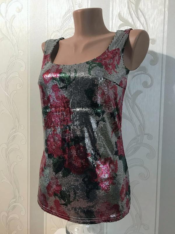 Топ нарядный праздничный, очень эффектный. Спереди трикотаж вышитый пайетками полностью, дополнительно имеется подкладка из второго слоя стрейчевой ткани, на спинке однотонный трикотаж. Идеально сидит на 44-46 размере, красиво тянется. Заміри на фото. Был одет 1 раз Параметри Манекена: Груди 80 см Талия 58 см Стегна 82 см