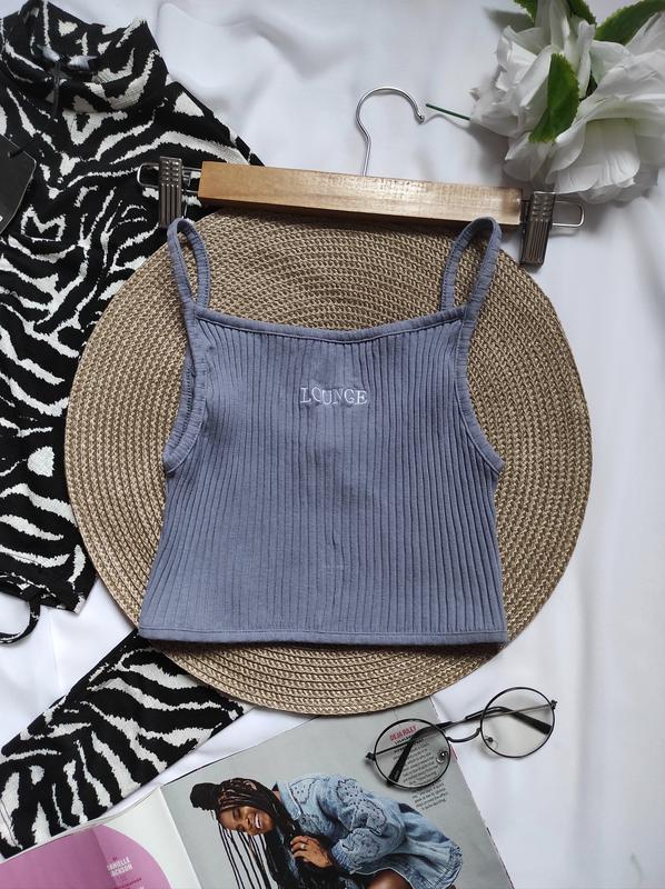 Стильный укороченный топ в рубчик на тонких бретелях с надписью майка кроп-топ удобный