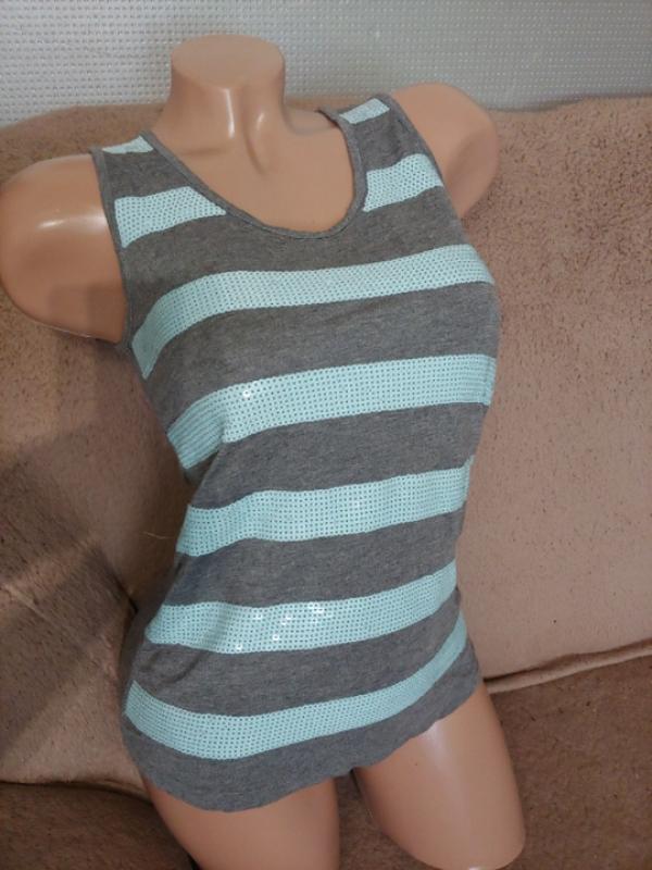 S майка в пайетках в красивом состоянии- все пайетки на месте. есть рисушка пятнышка размером меньше пайетка. ПОГ36см ПОТ 34см. Длина посередине по спинке 57см. Отдам в дар к любимой покупке.