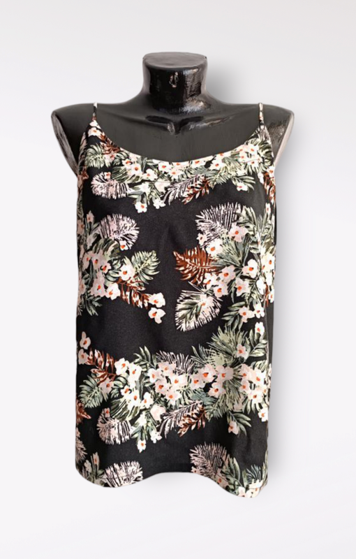 стильная женская маечка на бретельках черного цвета с цветочным принтом размер указан L, но ориентируйтесь по замерам ПОГ 51 см ПОТ 51 см ПОБ 55 см длина от вращальки 58 см 100% вискоза тканина, практично, не тягнеться
