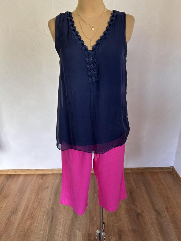 Легкая блуза выполнена из воздушной верхней части с добавлением шелка, снижняя-эластичная майка из вискозы,була в носке,легкая потеря цвета по верхней части кружева, мастерже не видно в носке,показала на последнем фото, учитывала в цене, по наборке размер М, подойдёт ориентивно на размер 48/50, по сравнению с измерениями👇👇👇 По плечам 35 см Полуобъем по груди 49 см тянется до 53 см Полуобъем по талии 50 см Полуобъем по бедрам 55 см Длина по спине 66 см, по боку 40 см Пройма 23 см Замер нижней майки👇👇👇 Пог 43 см тянется до 55 см Поб 45-66 см Арт 5073