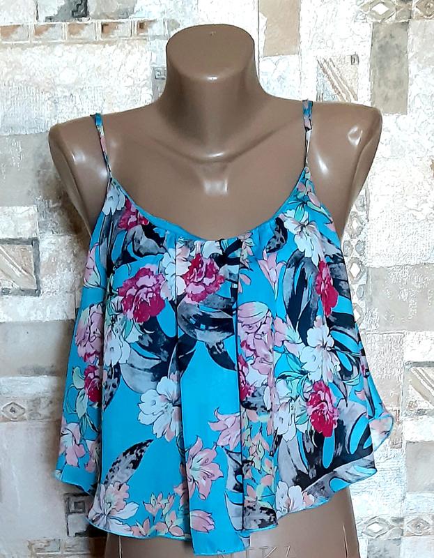 Очень красивая яркая майка топ разлетайка бренд Tally Weilji шифоновая с вшитой трикотажной майкой на резинке, бретели регулируются, рисунок экзотические цветы размер М. ЗАМЕРЫ длина от плеча майки/разлетайки 36/42-56см, ПОГ41-52см 62