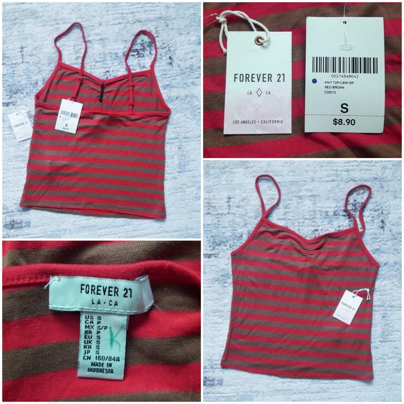 Легкая и необычайно приятная к телу летняя майка от американского бренда Forever 21. Майка новая. Цена 8.90$. Цвет: чередование полос ярко красного цвета и коричневого цвета с ноткой хаки. Материал очень тонкий и необычайно приятный по тактильным ощущениям, по типу футболок, но с лёгкой шелковистостью. Он такой, как если бы хлопок соединить с шелком. Состав: 95% район ( натуральная вискоза), 5% эластан. Указываю несколько размеров поскольку размерные сетки разных брендов отличаются и материал сильно тянется. Размер: S (евро), наш: 42?-44-46?, но для уточнения смотрите замеры: длина от линии плеча 48см; длина спереди, по средине 32см; длина по боковому шву 25см; длина по спине 25см; первый замер в спокойном состоянии, а второй в растянутом: полуобхват от подм. до подм 36-48см; полуобхват по талии 33-48см; полуобхват по нижней линии 35-50см.