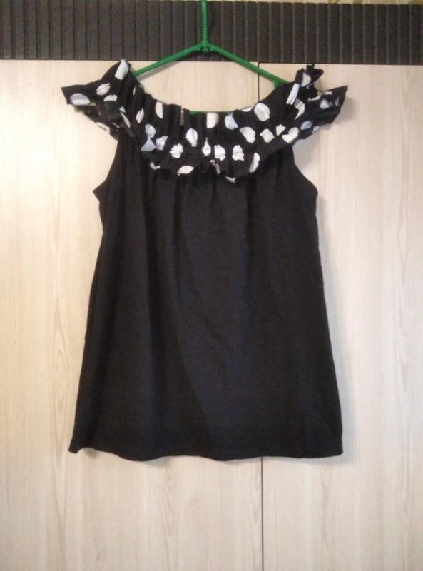 Майка женская с плечеками рюшами,плечеки на резинке можно носить как майку, или спустить плечики, верх белый горошек,приятная ткань.Новая.