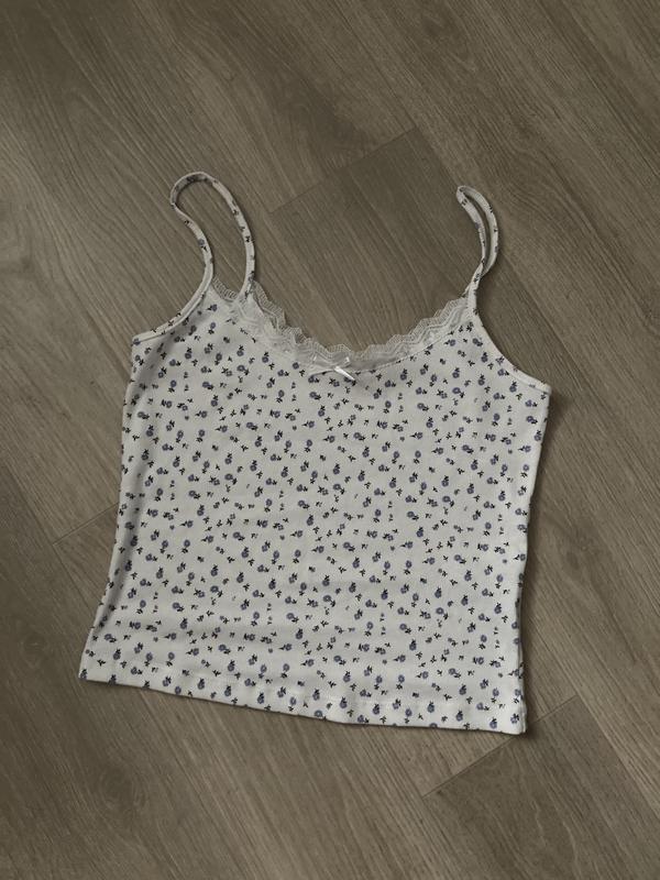 Майка жіноча біла в дрібну блакитну квіточку. Заміри: довжина 32 см, ширина 38 см