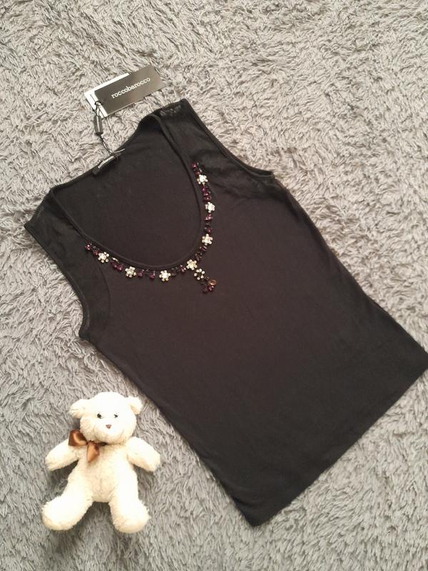Новая черная футболка от roccobarocco. По вырезу горловины украшена стразами, по вырезу плеч сетка.