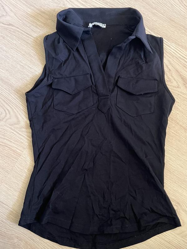 Футболка-майка женская в черном цвете, спереди два кармана,также есть воротник. Стан хороший👌🏻