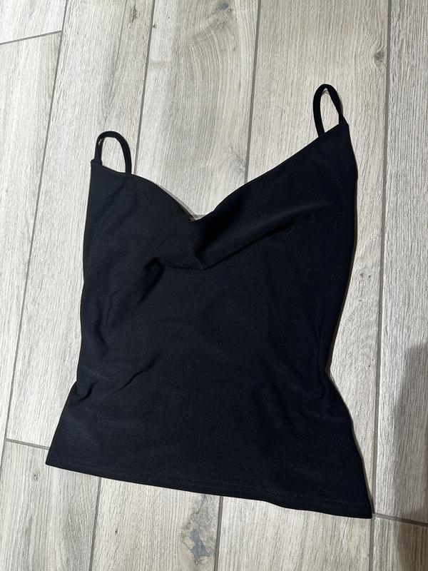 Чорна майка з відкритою спиною. Ззаду по спині йде резинка та на завʼязці. Тканина блискуча. Куплялася в Європі.
