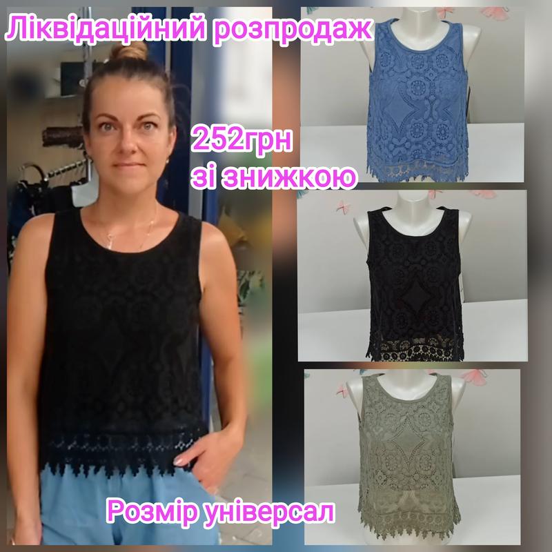 🤑 Ликвидационный распродаж 🤑 Красивые майки топы. Остались 3 цвета. Отличная база под костюмы или пиджаки или же как самостоятельная вещь летом. Моделька - свободного кроя. Материал переда - прошва, коттоновое кружево. Тканина тягнеться. 🏷️ Размер универсальный, подойдет на С, М, L. 🌈 Кольори: ✅ Хакі ✅ Голубой ✅ Черный Made in Italy 💳 Цена 360-30%=252грн ‼️ К слову. у нас есть к ним шортики из такой же ткани в тон Отправляем: Новой почтой - каждый день, Укр по почте - в течение 1-3 дней. Розетка - в течение 1-3 дней. Есть обмен. Есть возврат. Есть наложенный платеж. Есть возможность примерки и самовизволения в Луцку в наших магазинах