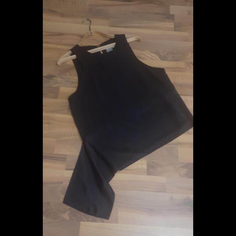 Элегантная не стандартная вещь, подойдет и на каждый день у кого работа соответствует такому стилю и на вечеринку, и на праздничное событие; цвет насыщенный черный, верхняя часть в виде шифонова, нижняя в виде атласной ( фото); очень глубокая пройма и "вырез рукава" настолько, что стандартный бюстгалтер будет виден