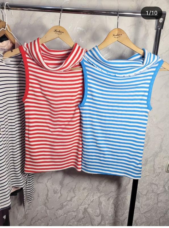 129 грн за шт ❤️ топ в полоску с интересной высокой горловиной, тянутся Синий Красный ☑️ Размер- м ☑️ Бренд- × ☑️ Состояние- идеальное Фото на теле не делаю!!!