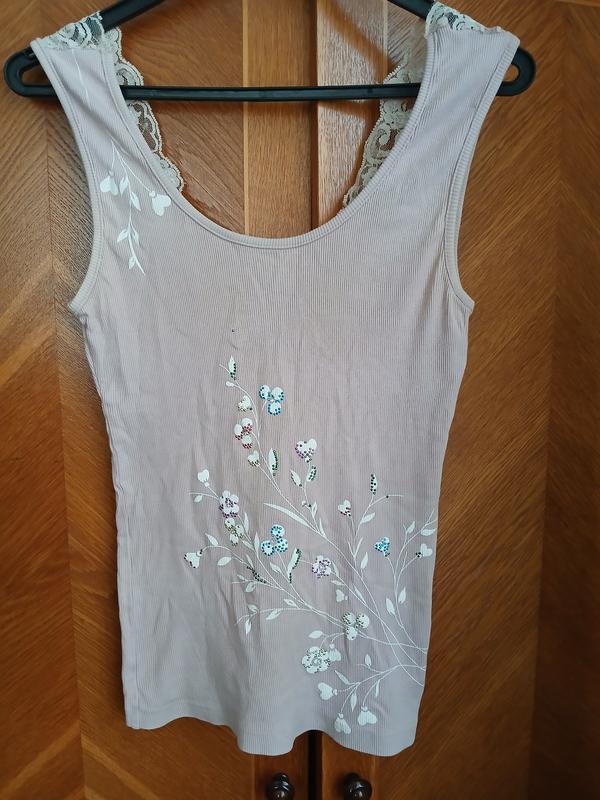 женская майка в рубчик. спереди декорирована принтом цветов, а спинка украшена эластичным кружевом. выглядит нежно. цвет сухая роза. ширина 35см, длина 58см.