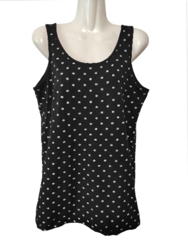 Удлиненная, котоновая майка в мелкий горох от бренда ******* Размер указан L длина от плеча 70см ПОГ 52 см тянется до 62см ПОТ 46 см ПОБ 50 см Состав: 95% котон, 5%эластан