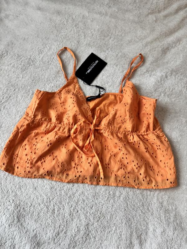 Оранжева майка на бретельках, укорочена,під грудьми є поясок для затягування