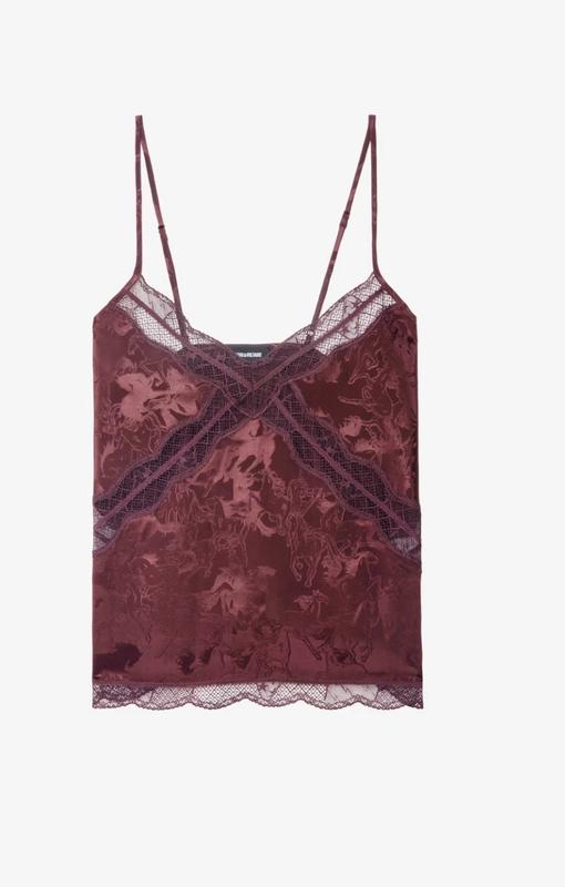 100% шёлк - Жаккардовый узор «лошадь» - V-образный вырез - Регулируемые бретели - Французское кружево и вышитые крылья на спине Это французское кружево было создано Софи Аллетт эксклюзивно для Zadig & Voltaire. 100% sholk
