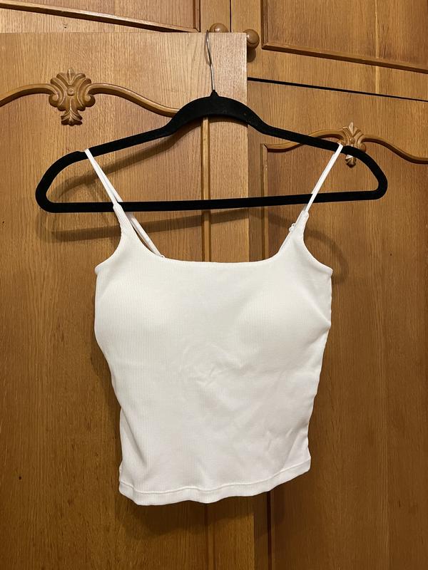 Біла майка з чашками в рубчик, вкорочена, бретельки регулюються. Розмір S. Стан хороший, без недоліків.