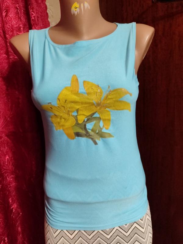 В идеальном состоянии, как новая.Спереди лилия с блеском, ткань приятная, яркий голубой цвет.Как стрейчевая, хорошо тянется.Пог-40см, пот-35см, длина изделия -54см.Есть еще много чего интересного, подписи на обновление.Все вопросы пишите на сайте Шафы, дополнительную информацию предоставляем, фото тоже. Предлагайте свою цену, договариваемся.
