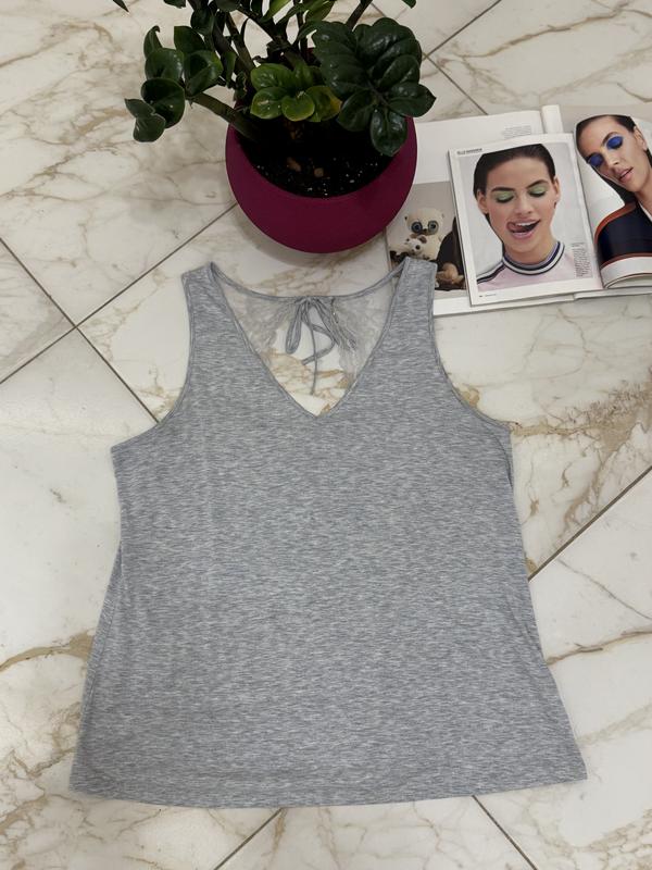 Жіноча базова сіра маєчка з мереживом і завʼязками на спинці у розмірі L/XL. Стан - ідеальний. Склад: 60% поліестер, 36% віскоза, 4% еластан.