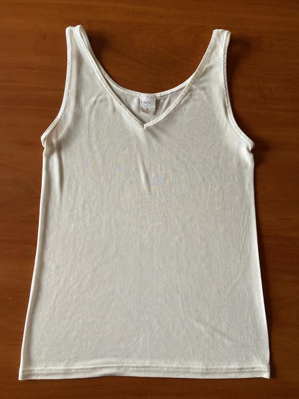 Жіноча біла майка з натурального шовку від швейцарського бренду Sawaco, розмір S. V- подібне декольте, безшовна. Ширина спинки 25 см, напів обхват під руками 35,5 см, пів обхват по талії 35 см, пів обхват по низу 38,5 см, довжина з боку 37,5 см, довжина виробу 55,5 см. Склад 100% натуральний шовк.