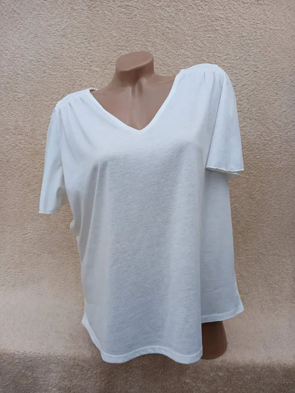 Беленькая маечка ,чуть как с напылением золотистых точек,смотрится нарядно,состояние идеал ПО груди 60-62, ПО бедра 60-63, длина 61 Замeры вeздe половина