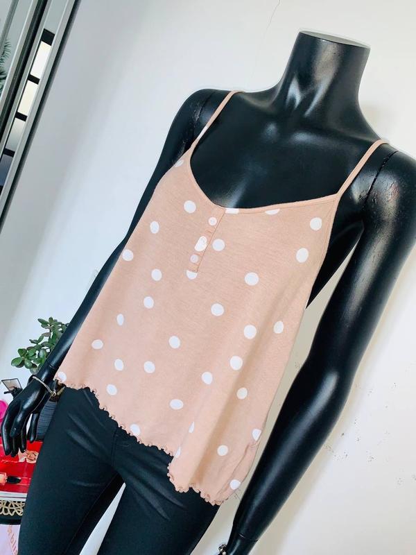 Легкий женский летний топ Primark на тонких бретелях. Цвет бежево-розовый с белым принтом в горошек, застежка-планка на пуговицах и волнистый край. Свободный крой, мягкая ткань: 95% модал, 5% эластан. Размер L (UK 16/18).