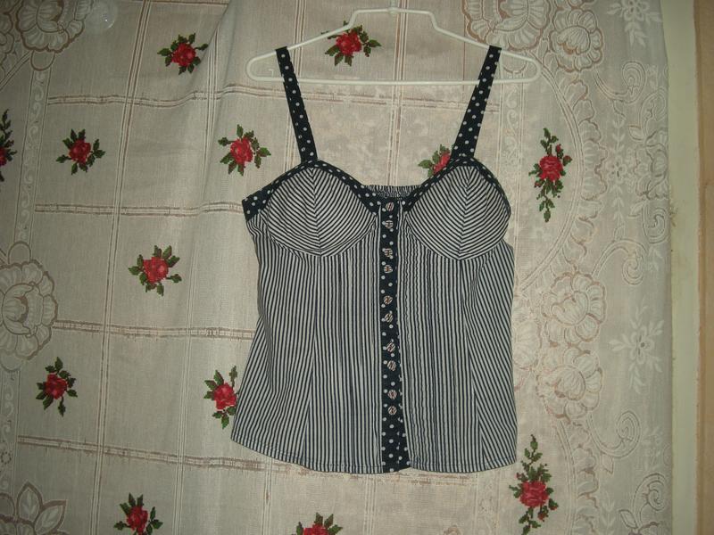 Шикарная летняя майка в бело-синюю полоску и горохи,фирменная,натуральная-100%коттон,Индия,застегивается впереди на красивые пуговицы,обтянутые полосатой тканью,сзади по центру вставка из сжатой резинки,глубокие чашки где-то на 2-й размер,длина-57см.