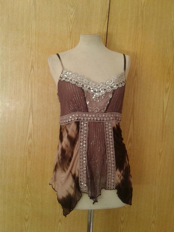Маечке на тонкой сетчатой подкладке. Вставки из шелковой ткани с люрексом. Бретели регулируются. Размер - L / 12. Замеры : ПОГ - 42-53см ПОТ ( по ленте под грудью )- 38-40см ПОБ - 50-67см ДИ от верха лифа- 49см и 61см. Бренд - SOULT.