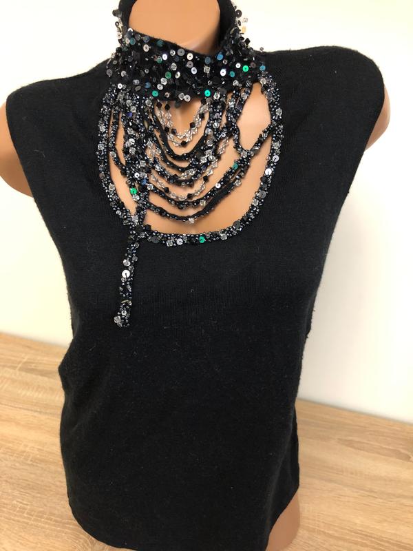 Шикарная майка, дорогой французской фирмы, украшенная кристаллами и бисером, невероятно красивое дополнение под любой блейзер, содержит в составе шерсть, покупалась очень дорого. Подойдет также и на 46 размер. Не сток, не секонд, без запаха. На ней есть катышки, которые легко удаляются, других нюансов нет, хорошо подойдет к новогоднему наряду. Смотрите также другие мои лоты, много одежды для больших девочек, обуви, аксессуаров.