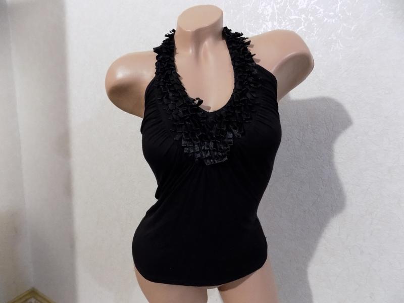 Майка черная с жабо на груди размер 40-42. Длина от подмышки 34 см, ширина в груди 36 см + тянется до 42 см. На шее завязывается. Смотрите все мои товары, большой выбор, низкие цены) Только самые продвинутые знают, как одеваться модно и недорого при минимуме денег и выглядеть на все 100%. Приятных покупок!!!