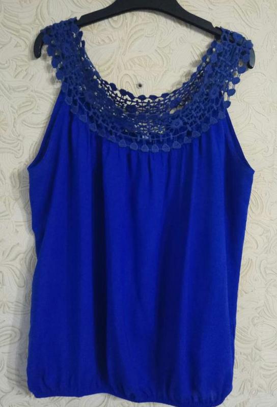 Майка с ажурным верхом 48-52 р-ру., яркого цвета индиго, с резинкой по низу изделия. Склад: котон. Замеры: по плечам 44 см.; пройма 23 см; об.грудей 56 см.; по низу изделия 39/64 см; длинне. изделию от плеча 63 см. Перешлю после 100% оплаты на карту. Отправлю Новой или Укр.почтой. По дополнительной информации обратитесь.