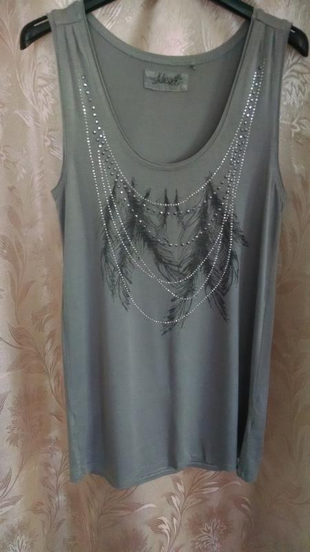 Удлиненная майка next, красивого серо-стального цвета, с мерцающим декором в виде ожерелья. Декор не отваливается, прикрепленный надежно. Состояние новой вещи. ► Размер указан 38М. Хорошо тянется. Ткань 95 % вискоза, 5 эластан. ► Длина 71 см.