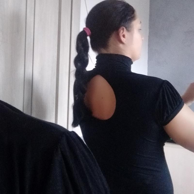 черная майка с красивым вырезом на спине. воротник идёт закрывающий горло. майка на теле очень классно смотрится. предложила светлую ткань , чтоб было понятнее как идёт вырез