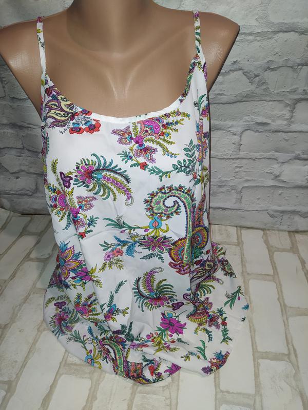 Легенькая маечка,с ярким рисунком,бретели регулируются,состояние очень хорошее,из минусов есть кое где зацепки,и несколько пятнышек,на фото указано,отстирывать не пробовала. За счёт рисунка незаметны. Размер указан Xl, длина майки от бретели до низа 70 см,от подмышки до подмышки 50 см,по низу 60 см